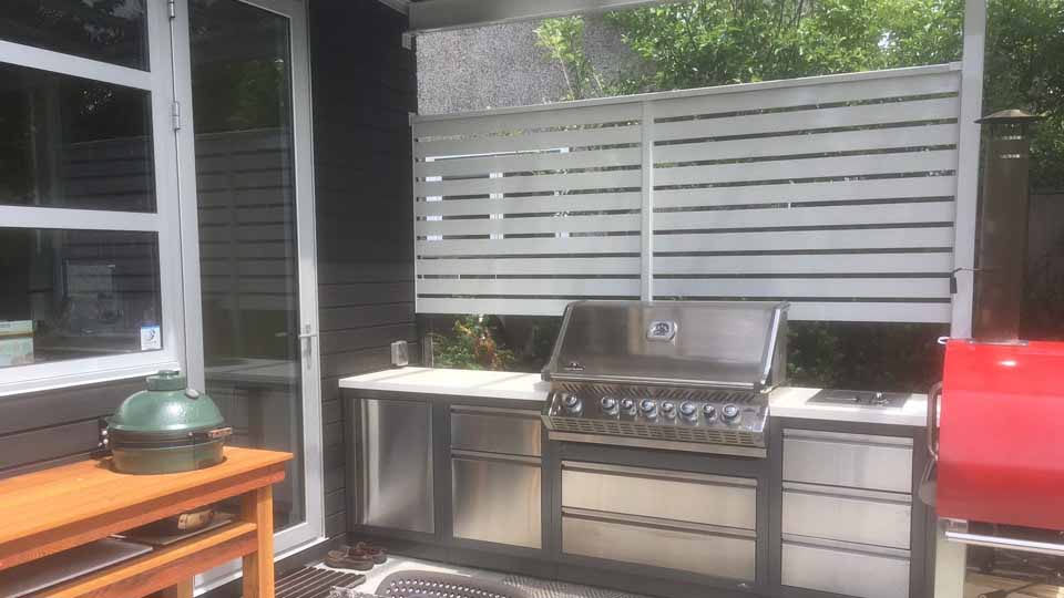 Time for family and fun, a custom grey aluminum BBQ cover with glass roof and privacy screen!